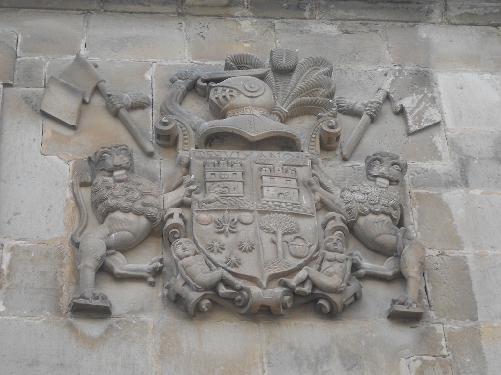Escudo heráldico de la familia Quijano Rasa. Sobre el campo del escudo un yelmo con brazo armado y dos banderas enarboladas que simbolizan la victoria militar que quería resaltar su promotor el capitán Don Pedro Quijano.